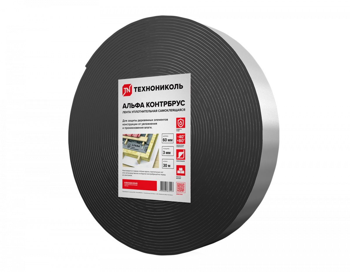 Читать все статьиЛента уплотнительная самоклеящаяся ТехноНИКОЛЬ АЛЬФА КОНТРБРУС 60 мм*30 м