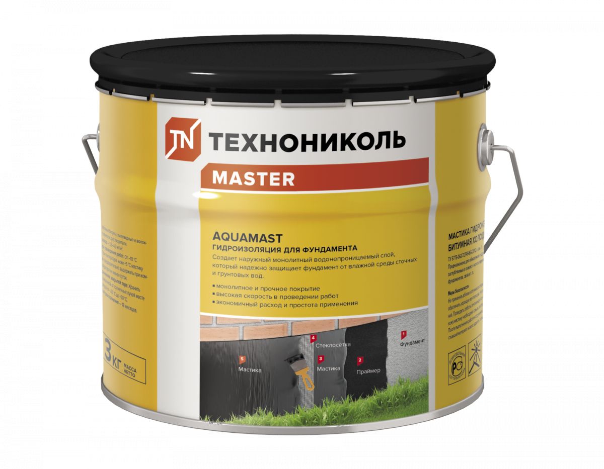 Мастика гидроизоляционная битумная для фундаментов AquaMast представляет собой полностью готовый к применению материал на основе нефтяного битума, содержащий технологические добавки, минеральные наполнители и растворитель. Предназначена для обмазочной гидроизоляции конструкций (бетонных, железобетонных, металлических, деревянных и др.), заглубляемых в землю и контактирующих с влажной средой: фундаментов, свай и т.п.