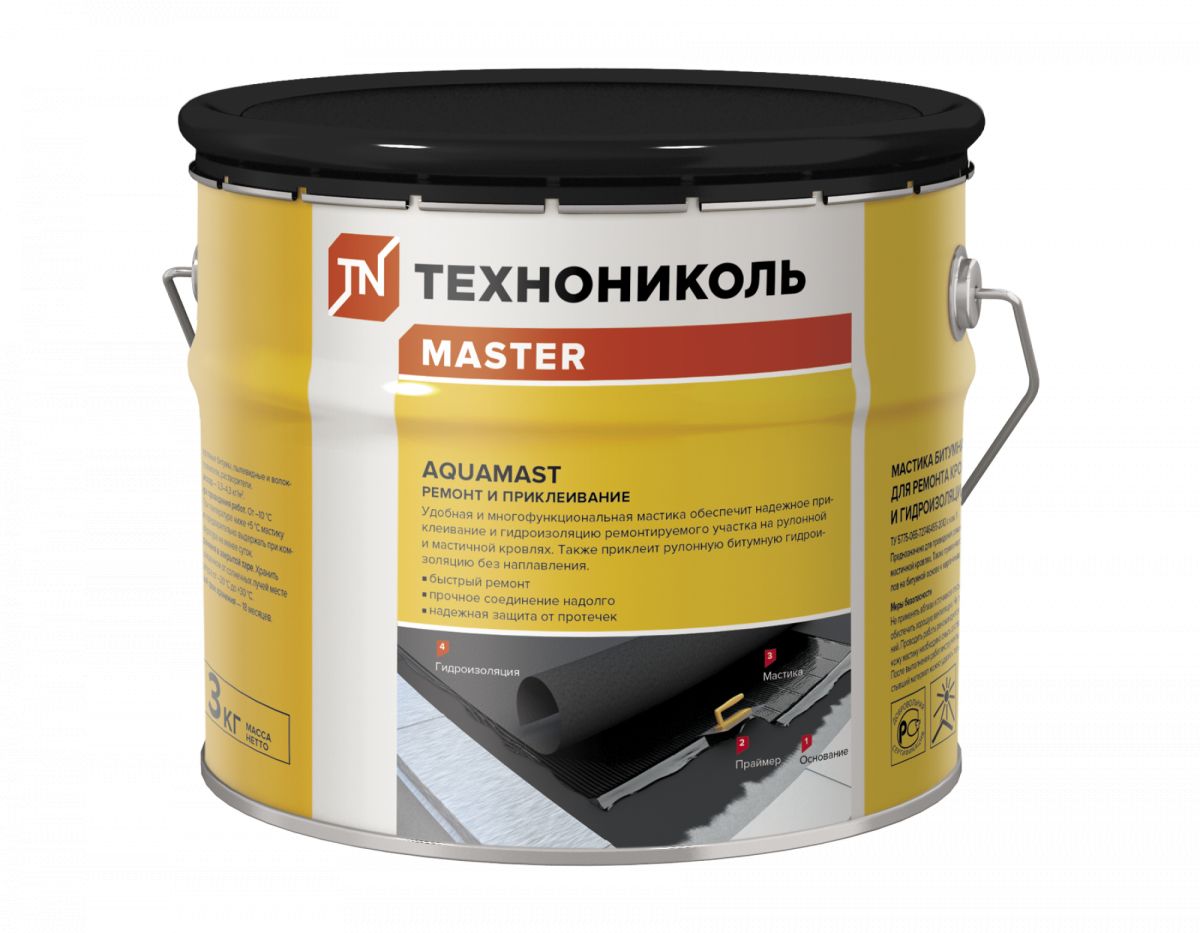Мастика битумная холодная для ремонта кровель и гидроизоляции AquaMast представляет собой многокомпонентную однородную массу, состоящую из битума, наполнителя, растворителя и технологических добавок. Предназначена для ремонтных работ на рулонной и мастичной кровлях; приклеивания материалов на битумной основе к кирпичным, бетонным, металлическим, деревянным, керамическим и другим поверхностям.