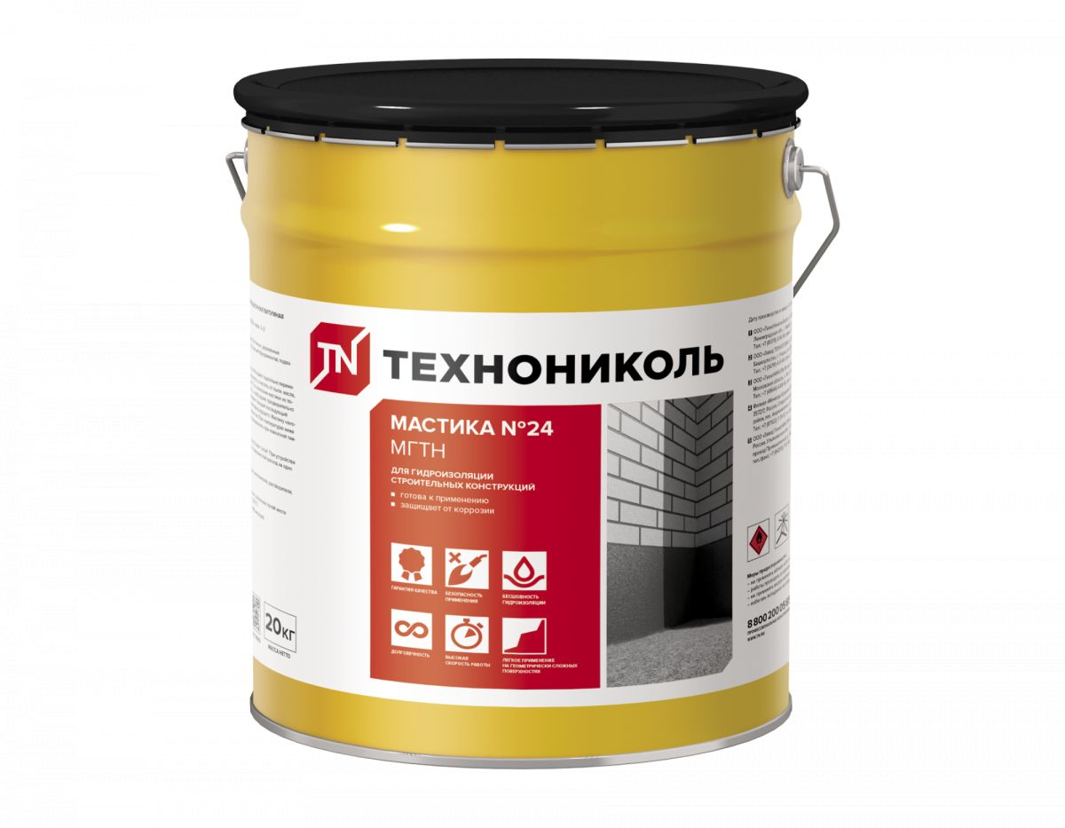 Мастика гидроизоляционная ТЕХНОНИКОЛЬ № 24 (МГТН) представляет собой полностью готовый к применению материал на основе нефтяного битума, содержащий технологические добавки, минеральные наполнители и растворитель. Предназначена для наружной гидроизоляции бетонных, железобетонных, деревянных и других строительных конструкций.