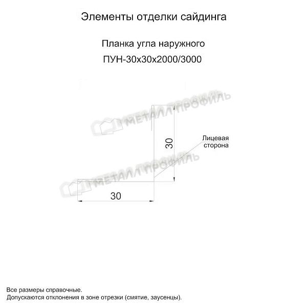 - - Не выгорает. - Планка угла наружного 30х30х3000 (ПЭ-01-7004-0.45) не ржавеет. - Украшает стандартные элементы отделки сайдинга. - Сталь не деформируется. Общая толщина оцинкованного металла с декоративно-защитным покрытием 0.45 мм. - Производится в любых цветах декоративно-защитных покрытий.