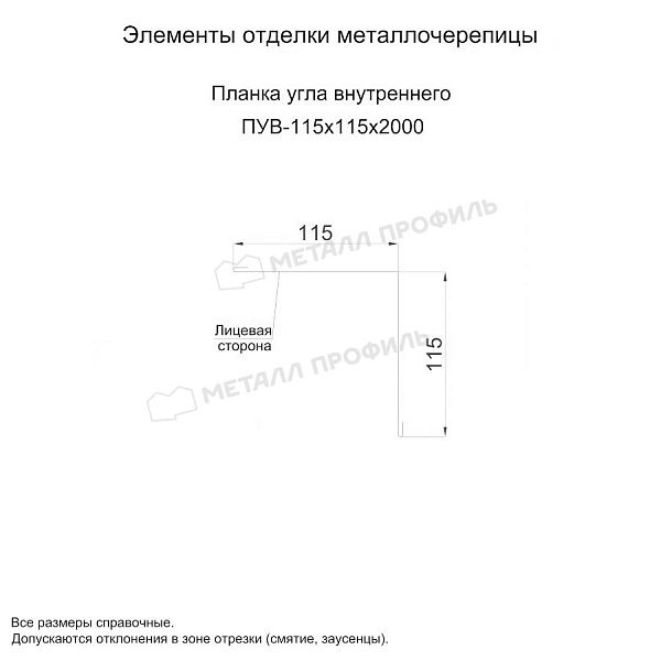 - - Большое количество цветовых решений. - Украшает стандартные элементы отделки. - Не выгорает. - Планка угла внутреннего 115х115х2000 (PURMAN-20-6005-0.5) не корродирует. - Стальная основа противостоит механическим воздействиям. Общая толщина оцинкованной стали с полимерным покрытием 0.5 мм.