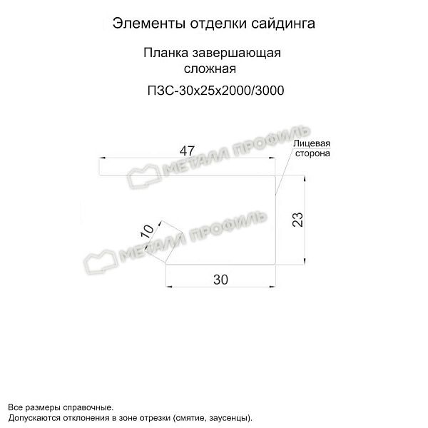 - - Не выцветает. - Планка завершающая сложная 30х25х3000 (ПЭ-01-3011-0.45) противостоит коррозии. - Изготавливается во всех цветах полимерных покрытий. - Стальная основа не деформируется. Полная толщина оцинкованного металла с полимерным покрытием 0.45 мм. - Выполняет декоративные функции.