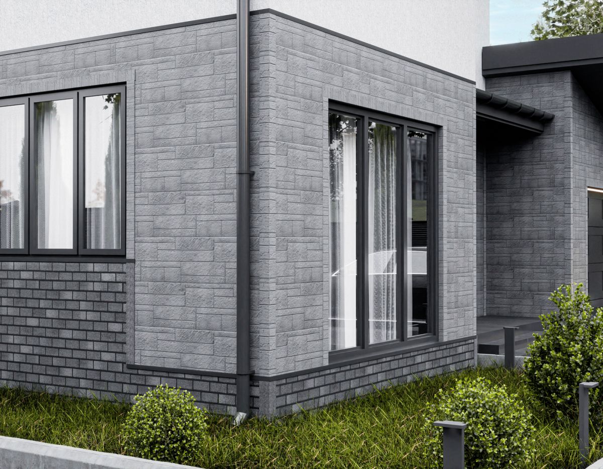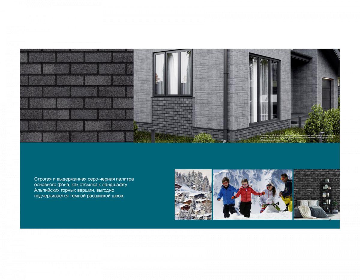 Строгая и выдержанная серо-черная палитра основного фона, как отсылка к ландшафту Альпийских горных вершин, выгодно подчеркивается темной расшивкой швов. Коллекция «Цокольный кирпич» создана для цоколя, но монтируется и на фасад. Выдерживает повышенные нагрузки за счет учеличенной толщины и массы плитки. Новый нижний клеевой замок на тыльной стороне плитки, состоящий из нескольких полос с бортиками увеличенной толщины, повышает адгезию на участках фасада, где требуется более высокая износостойкость.